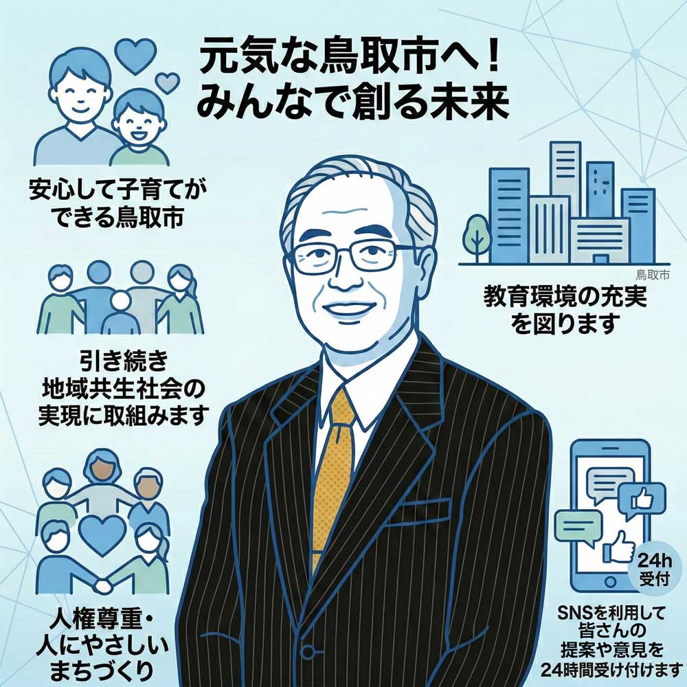- 鳥取に住んでよかったと思っていただくため高齢者福祉や障がい者福祉の更なる充実を図ります